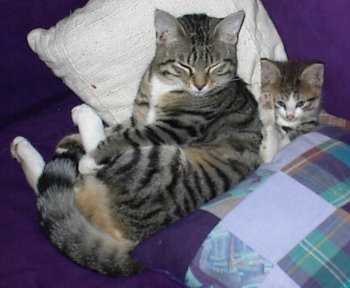 Perle, der her flader ud foran sin mor Bjelka, er desværre blevet kørt ned og hviler derfor nu under en sten i haven. Så vi har nu beholdt en af Bjelkas seneste killinger, Frederikke, til erstatning og det klarer hun strygende. Hun er ovenikøbet lige så god til at vælte blomstervaser som sin hedengange storesøster.